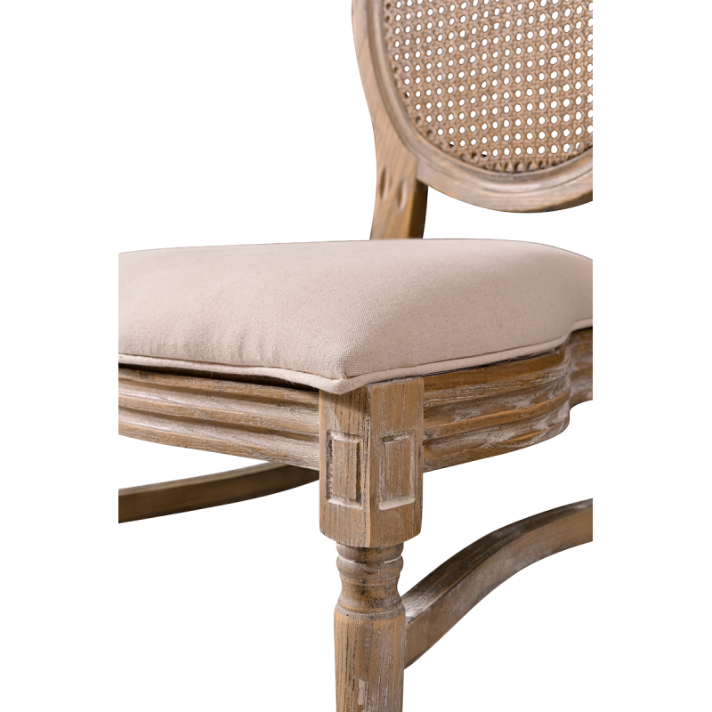 Made from solid wood, the chair provides the stability and durability required for intensive use in commercial spaces. The rattan backrest subtly breaks the classical form, adding a touch of lightness and refinement. The upholstered seat ensures comfort even during long celebrations and receptions.