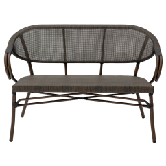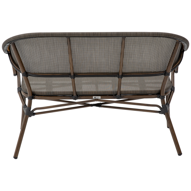 The seat and backrest are made of technorattan mesh with evenly tensioned surfaces, ensuring stable support during use. The subtle weave structure enhances seating comfort while adding visual lightness to the bench . This form of technorattan performs well in high-traffic areas, maintaining its shape and aesthetics over time.