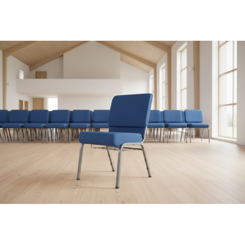 An additional metal basket (visible in preview images) can be purchased for the AMBASSADOR Church Chair, providing convenient storage for hymn books, prayer books, the Holy Bible, service programmes, or other community materials.