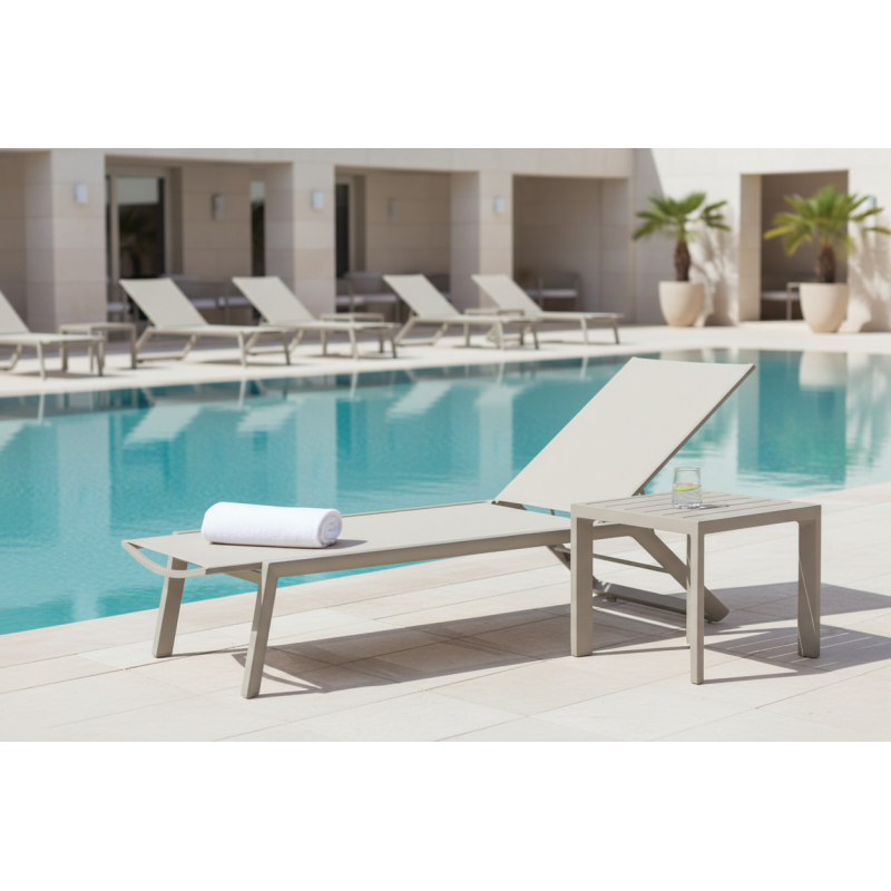 A dedicated AZURA pool side table in Champagne is available for this lounger (sold separately).